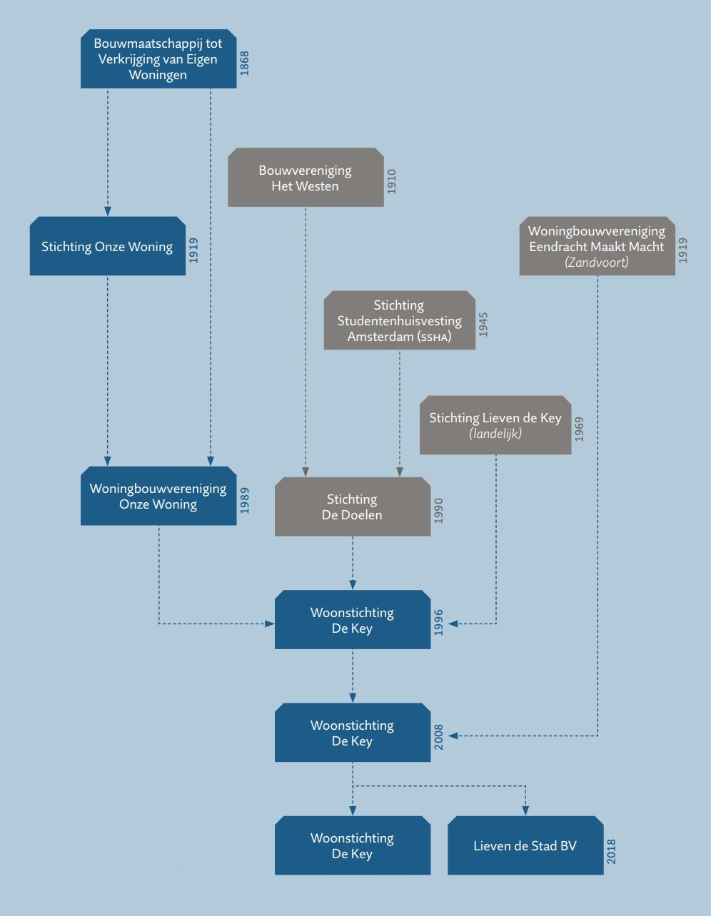 De stamboom van Woonstichting Lieven de Key en haar voorgangers zoals te vinden in "Het begon met Dubbeltjes..."